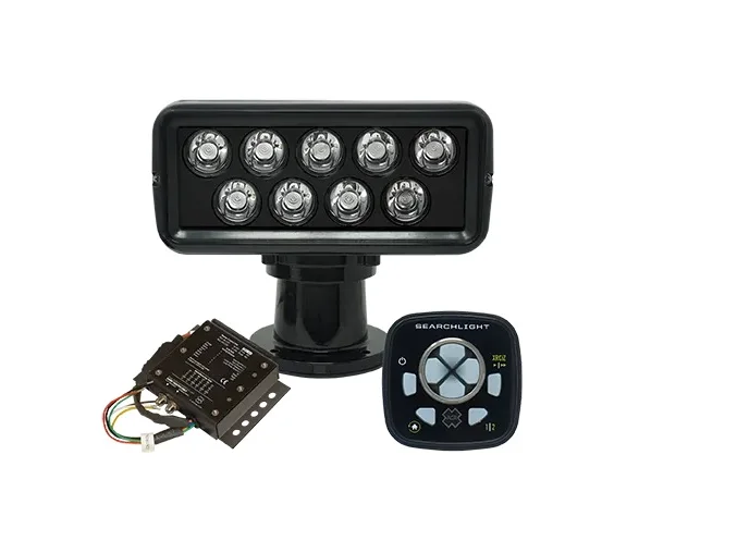 The RCL-100 LED searchlight continues to utilize the same rugged design as the original RCL-100D, but incorporates a new efficient 9 LED array that produces over 220,000 candelas of light. The strong and light aluminum housing along with glass lens are weather-sealed for years of trouble-free operation. Other features include a wired remote that allows continuous 360 degrees of rotation at fast or slow speed without the hassle of a hard stop. With a 7-degree beam angle, the light also provides elevation angles at 9 degrees up and 17 degrees down to make lighting draw bridges, buoys, and docks a breeze.